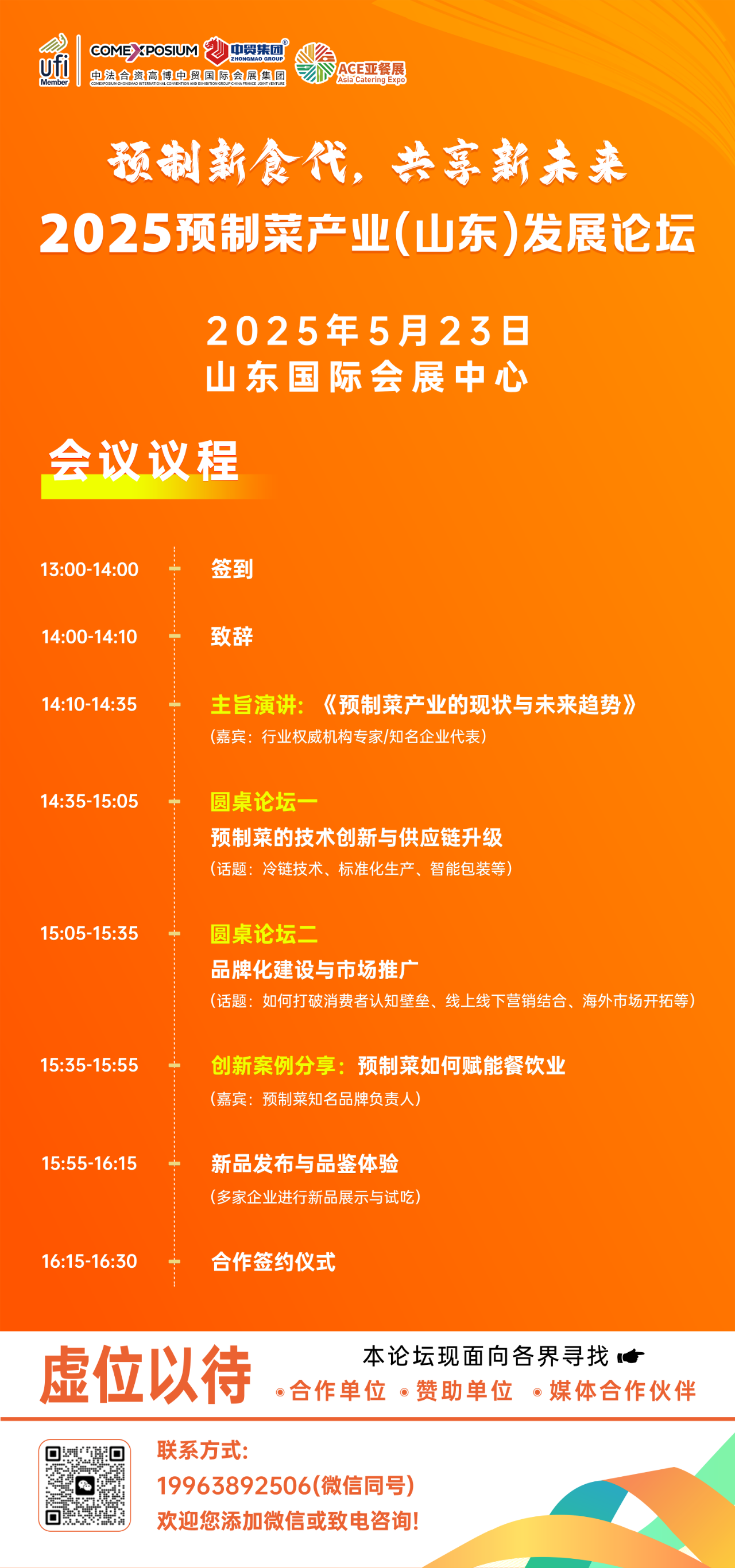 目前, 2025預制菜產(chǎn)業(yè)(山東)發(fā)展論壇組織籌備工作已經(jīng)正式啟動。現(xiàn)面向各界招募合作單位、贊助單位、媒體合作伙伴。如您有參與的想法,請致電19963892506(微信同號)。