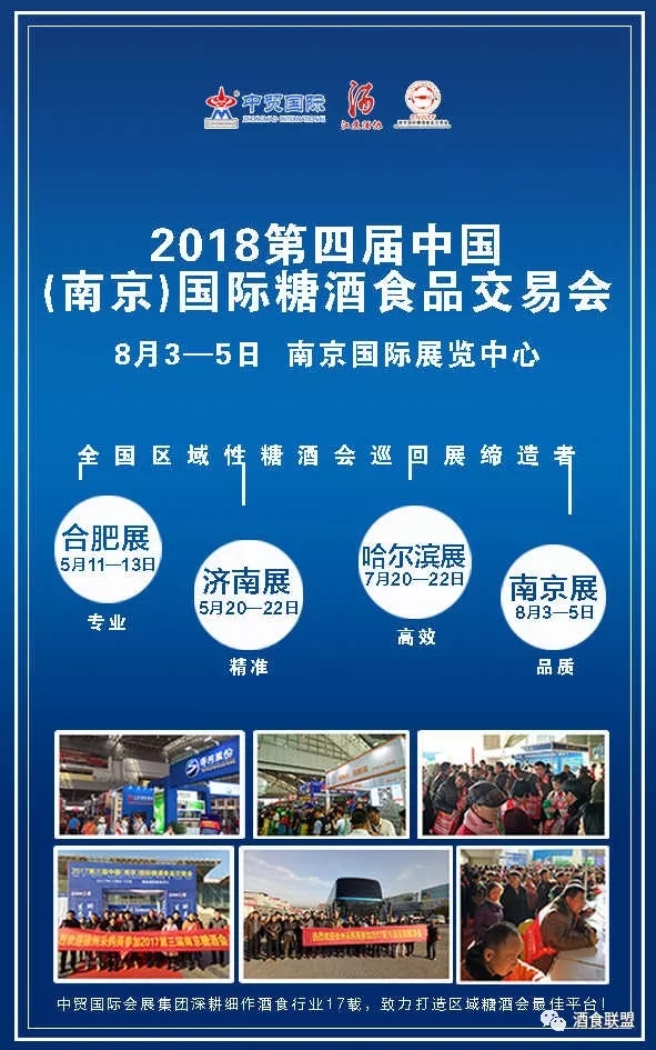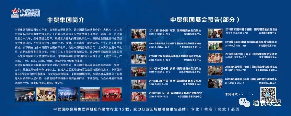 中貿集團2018年計劃將在山東濟南、安徽合肥、江蘇南京、黑龍江哈爾濱、浙江杭州等省市舉辦十余場次酒博會、食品展、餐飲展,形成聯(lián)動招商、資源互動和共享。