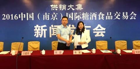 發(fā)布會(huì)正式開始之前,海南供銷大集控股有限公司華東區(qū)副總裁韓穎女士與山東中貿(mào)國(guó)際經(jīng)濟(jì)貿(mào)易推廣服務(wù)中心董事長(zhǎng)杜磊先生就“供銷大集”2016中國(guó)(南京)國(guó)際糖酒會(huì)簽署冠名合作協(xié)議。